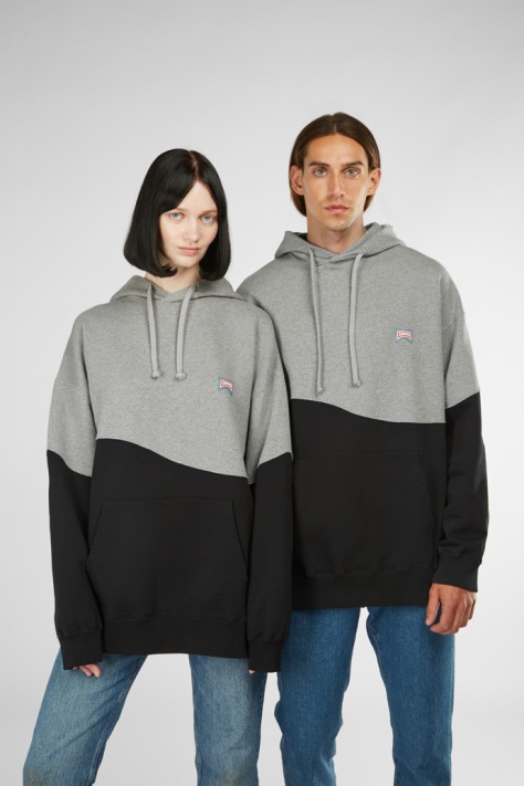 Szaro-czarna Bluza Unisex Z Blokami Kolorów I Wzorem Fali. 100% Bawełna Organiczna. Odzwierciedlająca Swobodę Sezonu Kolekcja Apparel łączy świeże Kolory Z Motywem Fali Przy Wprowadzającym Słoneczne Dni Na Plaży.Rozmiar I KrójUniseks Zaprojektowany Dla Luźnego I Oversize'owego Kroju Model Męski Ma 187 Cm Wzrostu I Nosi Rozmiar L Modelka Ma 179 Cmu I Ma Na Sobie Rozmiar L