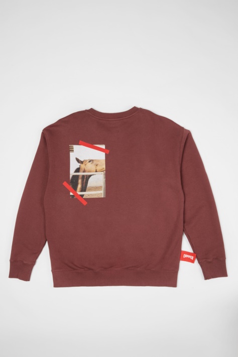 Bordowa Bluza Z Okrągłym Dekoltem, Wykonana W 100% Z Bawełny Organicznej, Z Długim Rękawem, Nadrukiem Konia Z Tyłu Po Lewej Stronie I Metką Z Logo Camper W Prawym Dolnym Rogu. Ta Swobodna Bluza Oversize Ma Z Tyłu Pokazujący Plakat Wizerunek Kłusującego Konia Z Majorki, Zaczerpnięty Z Kampanii Camper „The Walking Society”. Zainspirowana Korzeniami Marki, Działającą Wyspą Majorką, Kolekcja łączy Motywy Jeździeckie Z Wysokiej Jakości Bawełną Organiczną I Współczesnymi Fasonami Do Noszenia Na Co Dzień. Rozmiar I KrójUnisex Zaprojektowany Z Myślą O Luźnym Kroju Oversize Model Męski Ma 187 Cm Wzrostu I Ma Na Sobie Rozmiar L Modelka Ma 175 Cm Wzrostu I Ma Na Sobie Rozmiar M