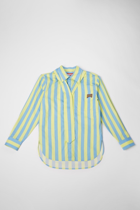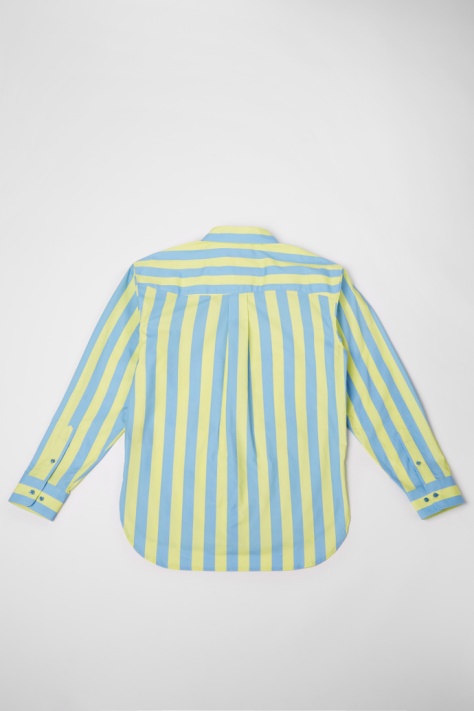 Koszula Unisex W Niebiesko-żółte Paski Z Kołnierzykiem I Odpinanym Krawatem. 100% Bawełna Organiczna. Odzwierciedlając Swobodę Sezonu, Kolekcja Apparel łączy świeży Kolory Z Motywem Fali Przy Oceniającym Słoneczne Dni Na Plaży.Rozmiar I KrójUniseks Przeznaczony Dla Luźnego I Oversize'owego Kroju Model Męski Ma 187 Cm Wzrostu I Ma Na Sobie Rozmiar M Modelka Ma 179 Cmu Wzrost I Ma Na Sobie Rozmiar M