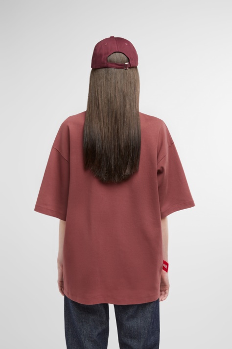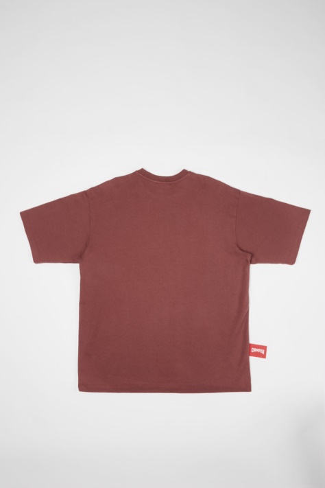 Bordowa Koszulka Z Okrągłym Dekoltem, Wykonana W 100% Z Bawełny Organicznej, Z Krótkimi Rękawami, Czerwonym Logo Camper Z Przodu I Metką Z Logo Camper W Prawym Dolnym Rogu. Ta Swobodna Koszulka Oversize Ma Z Przodu Czerwone Logo Camper I łączy W Sobie Wysokiej Jakości Bawełnę Organiczną Ze Współczesnymi Fasonami Do Noszenia Na Co Dzień. Rozmiar I KrójUnisex Zaprojektowany Z Myślą O Luźnym Kroju Oversize Model Męski Ma 187 Cm Wzrostu I Ma Na Sobie Rozmiar L Modelka Ma 175 Cm Wzrostu I Ma Na Sobie Rozmiar M